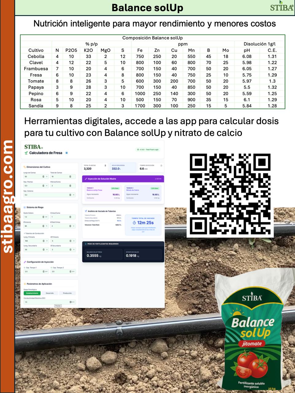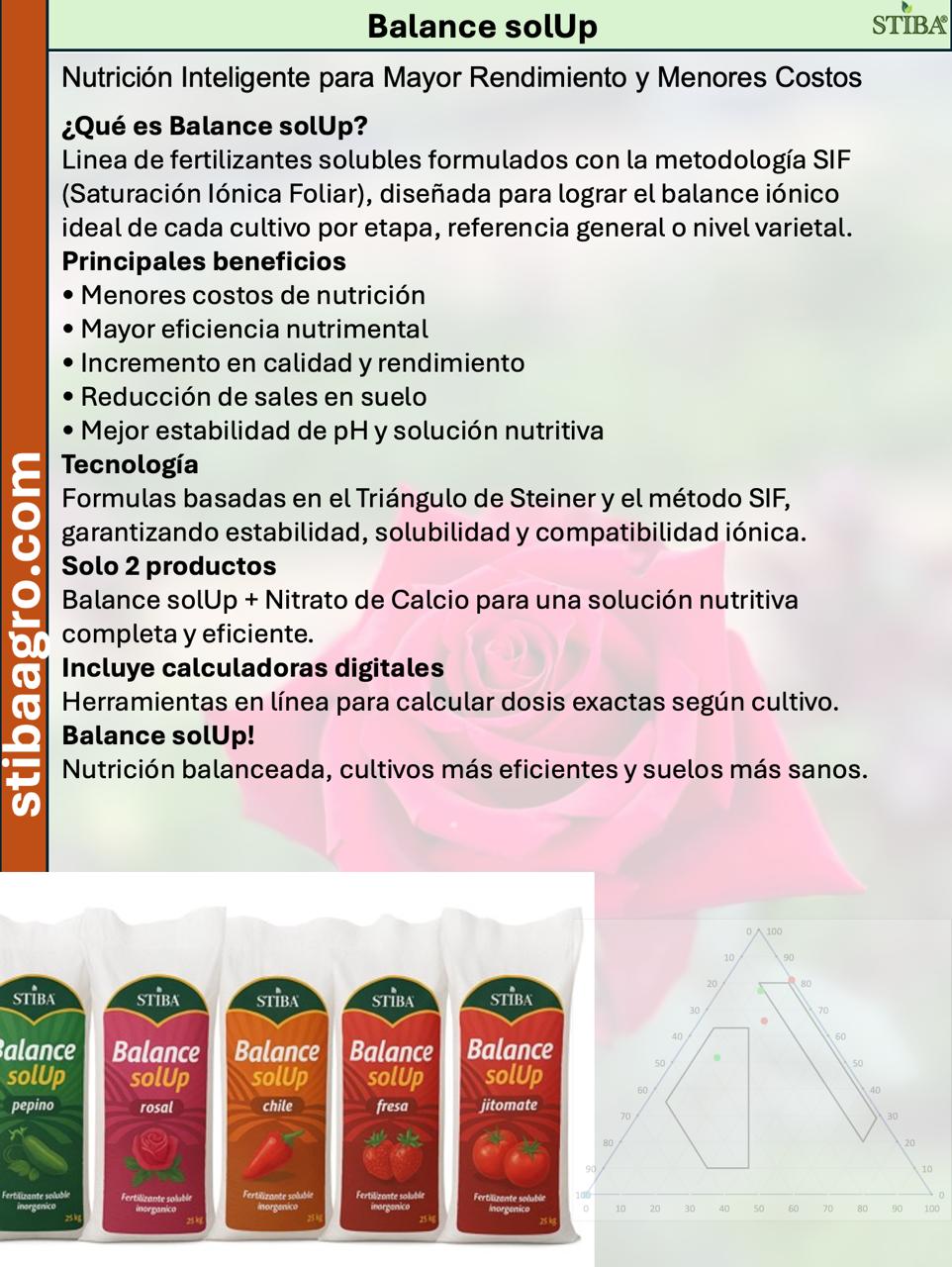 •Más eficiencia en la preparación de soluciones nutritivas debido a que solo son 2 productos a usar, formula Balance solUp más Nitrato de Calcio.